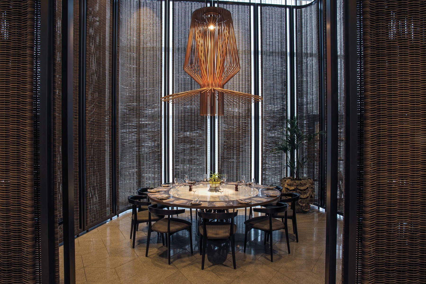 Dimly lit and sophisticatedly styled, this room offers intimate dining for groups up to 12 guests. Plush leather seating and a statement chandelier offer a breathtaking setting as guests graze and chatter amongst the round dining table.