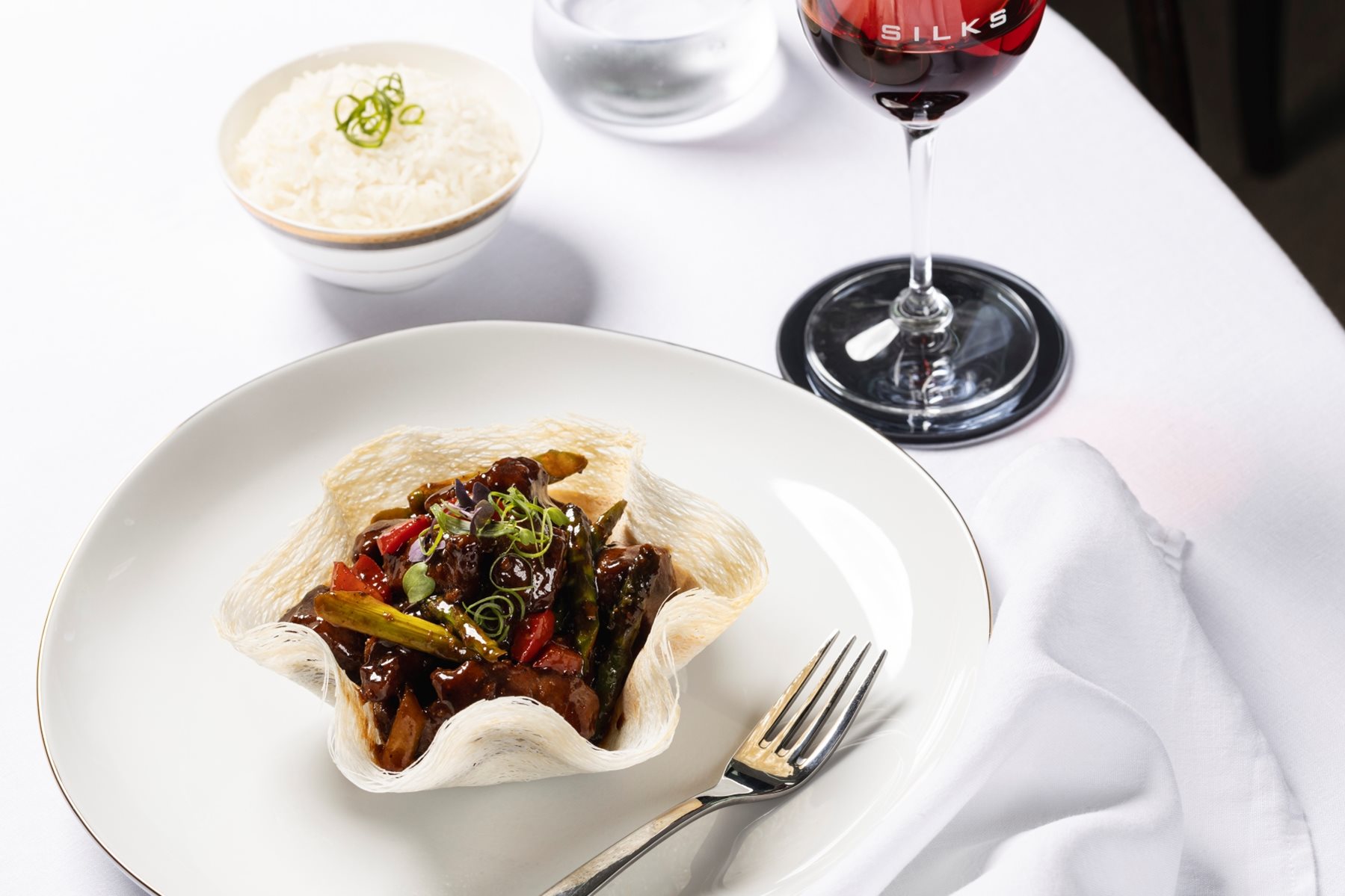 Five impeccable private dining rooms accommodate up to 12 guests in Silks signature Chinese grandeur.
