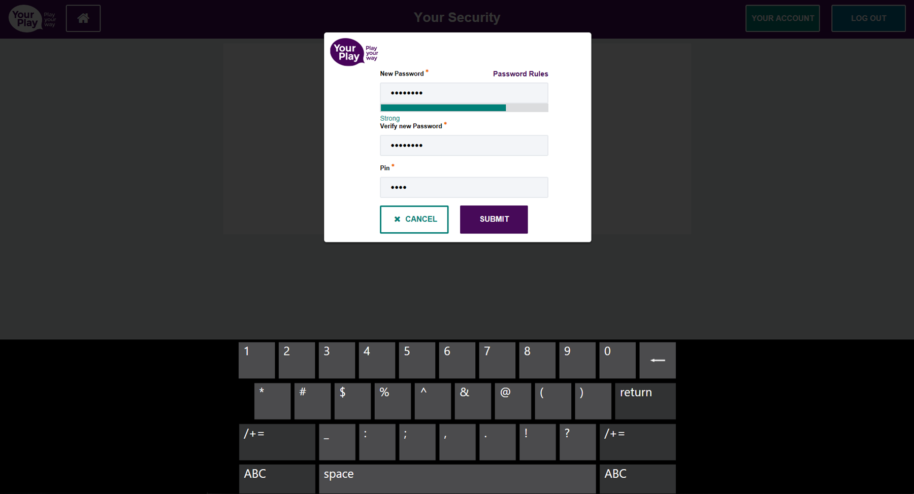 - Enter your new YourPlay PIN, verify with your password and click ‘SUBMIT’.