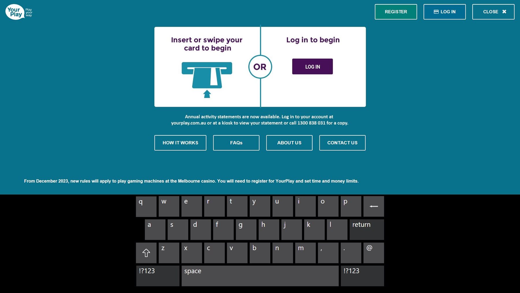 - Log into YourPlay on the kiosk using either your YourPlay username and password, or your Crown Member Card and YourPlay PIN.