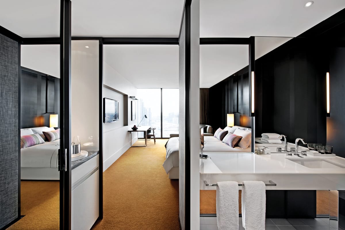 The City Luxe Room at Crown Metropol Melbourne features a custom made king bed, chaise lounge, desk, floor-to-ceiling windows, city views, fast and free internet, individual climate control, and boutique bath amenities.