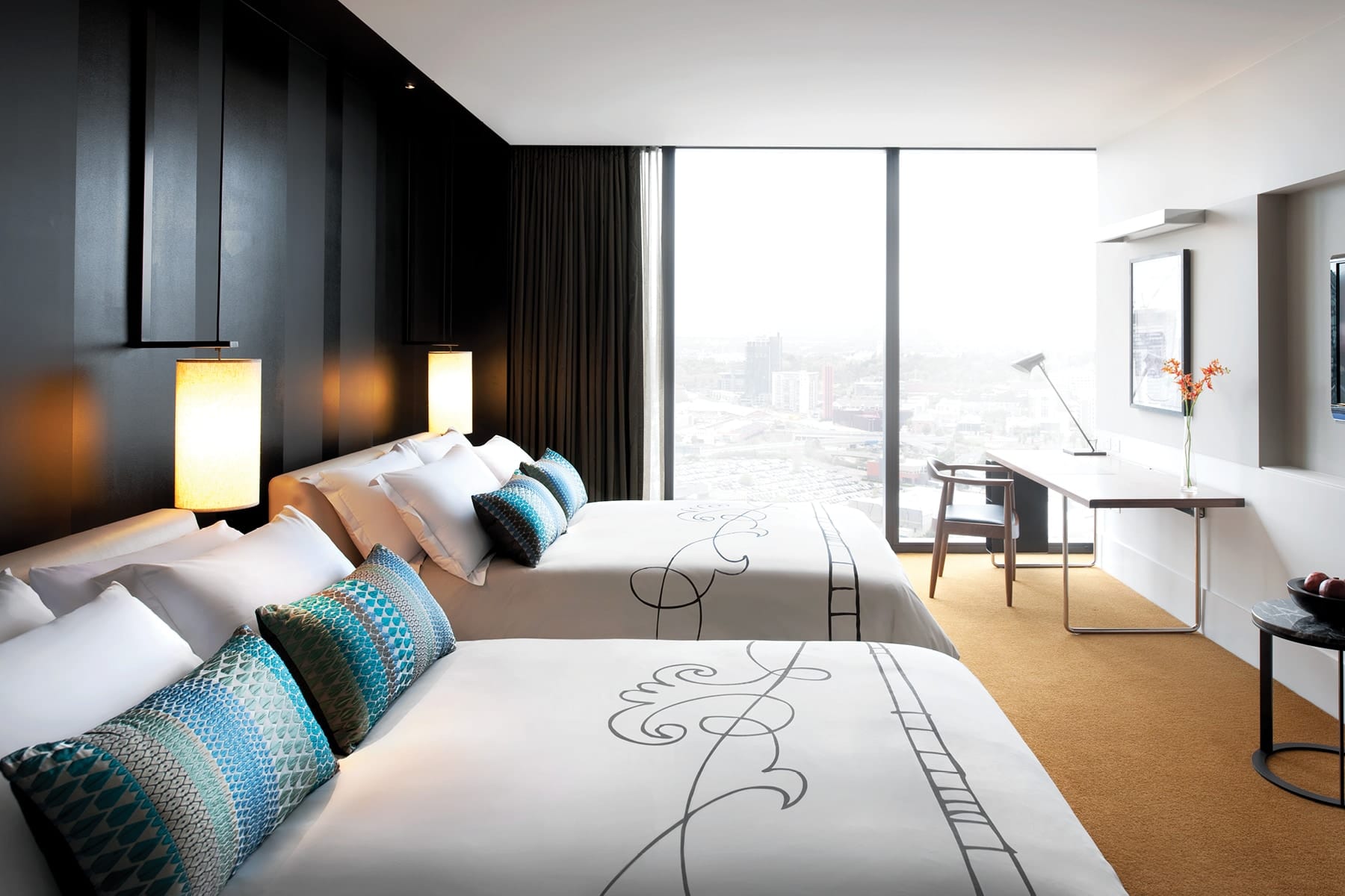 Located on the highest floors, the elevated Luxe Twin rooms feature two comfy beds, desk, floor-to-ceiling windows, bathroom with a privacy screen, fast and free internet, individual climate control and boutique bath amenities.