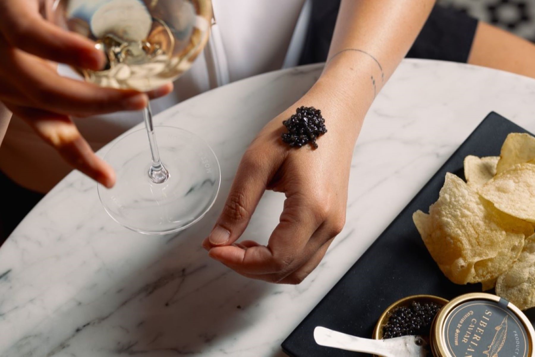 Enjoy a class of Moët & Chandon Imperial Rosé, accompanied by 30g of beluga caviar and Spanish potato chips.