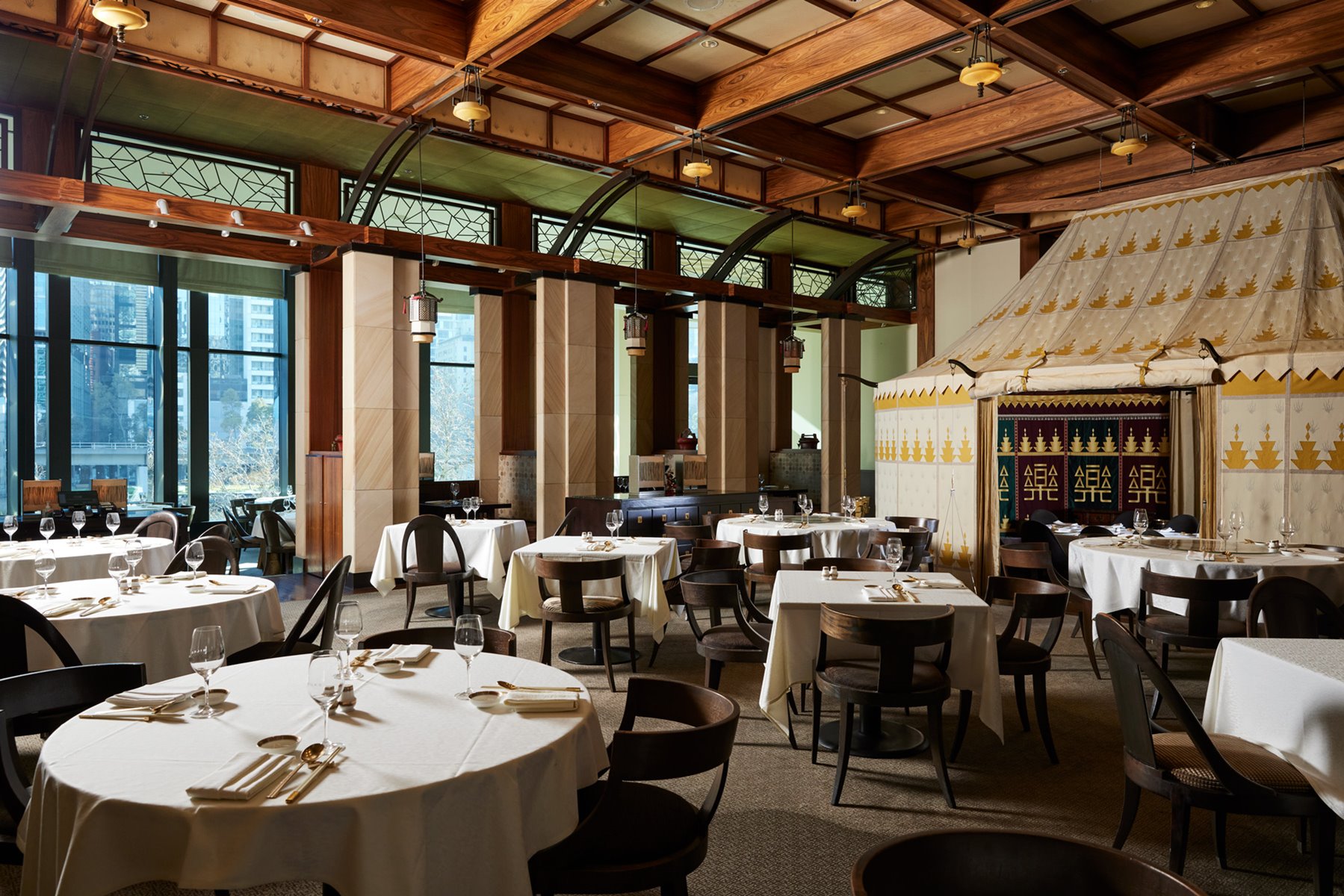 Four rooms feature Chinese-inspired tapestry and walls adorned with richly detailed woodcarvings, as well as stunning views of the Yarra River. The fifth private dining room – an impressive Mongolian tent – is the centerpiece of our private spaces, offering an intimate and unforgettable private dining experience for up to 12 people.
